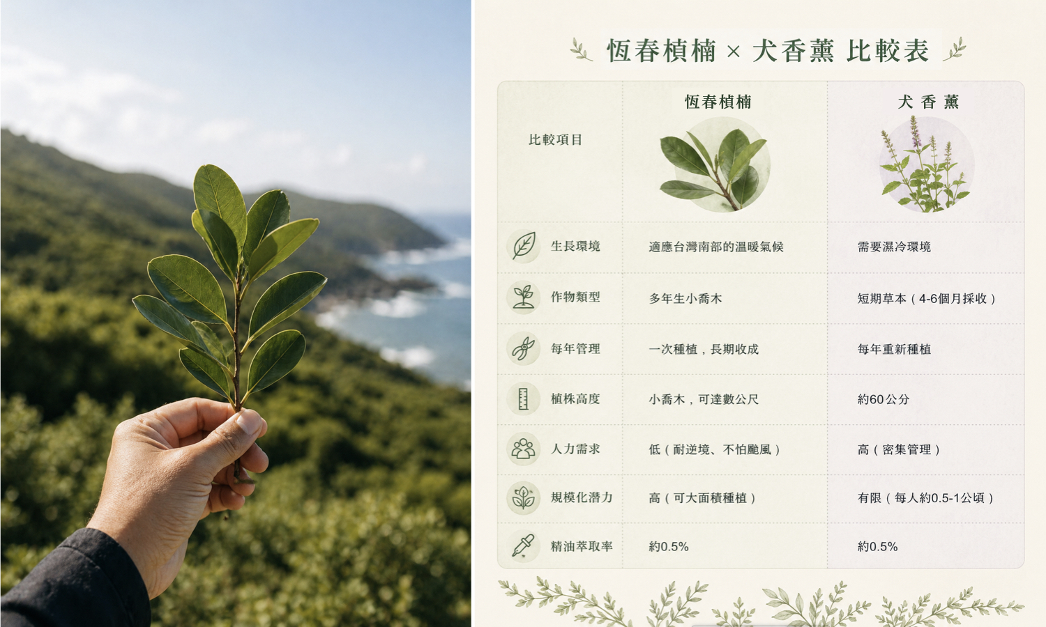 為多年生小喬木,具備耐風、耐逆境的特性,一次種植就能持續收成,也更適合在台灣環境中穩定發展。這樣的條件,使它不僅在氣味上成立,也成為一種更友善土地、能夠持續累積的農業選擇。