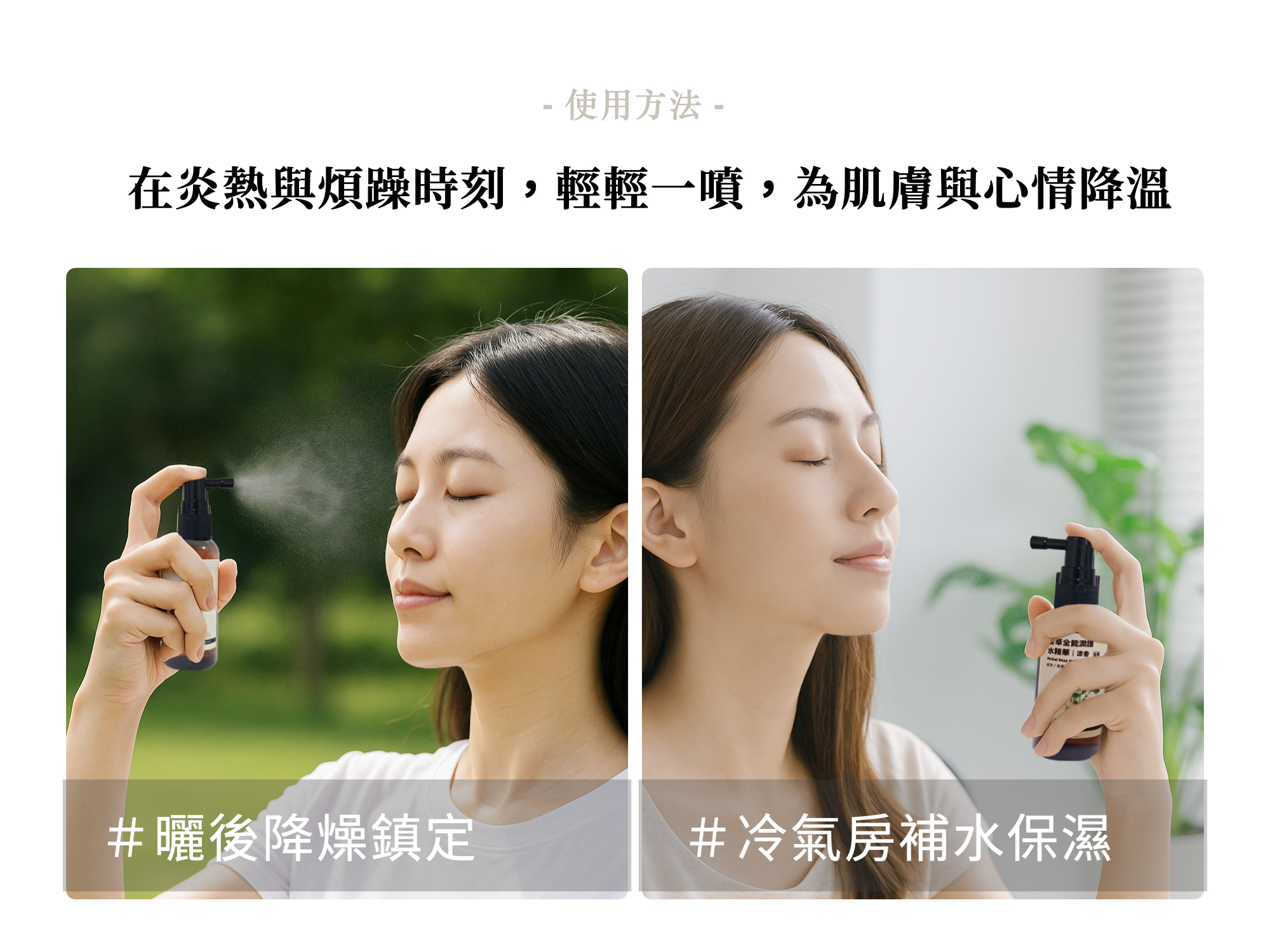 使用方法 │ 曬後鎮靜、冷氣房保濕,精華水噴霧,均勻噴灑於肌膚上,補水潤澤,舒緩肌膚之不適