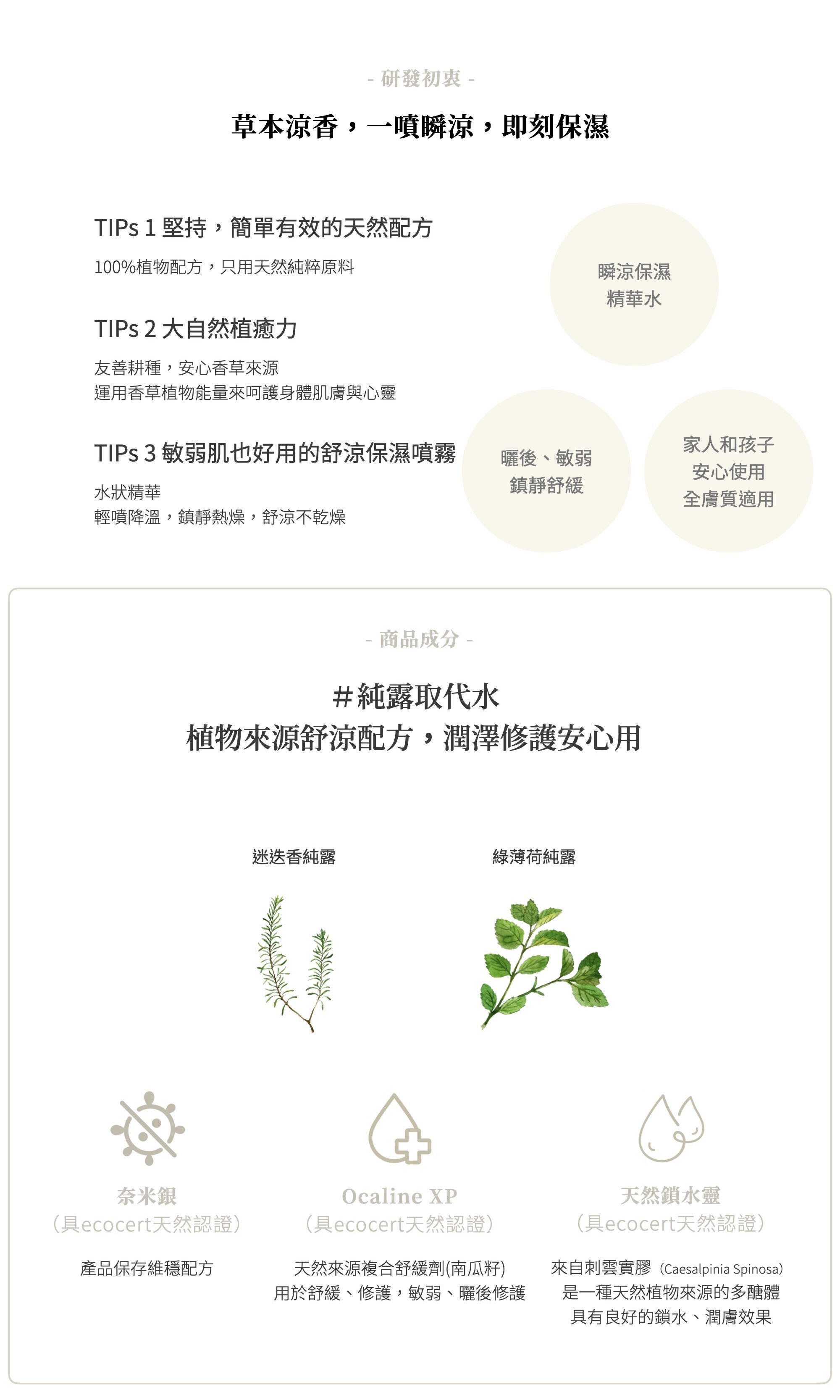 成. 分 │ 綠薄荷純露、迷迭香純露、天然鎖水靈、Ocaline XP、銀離子