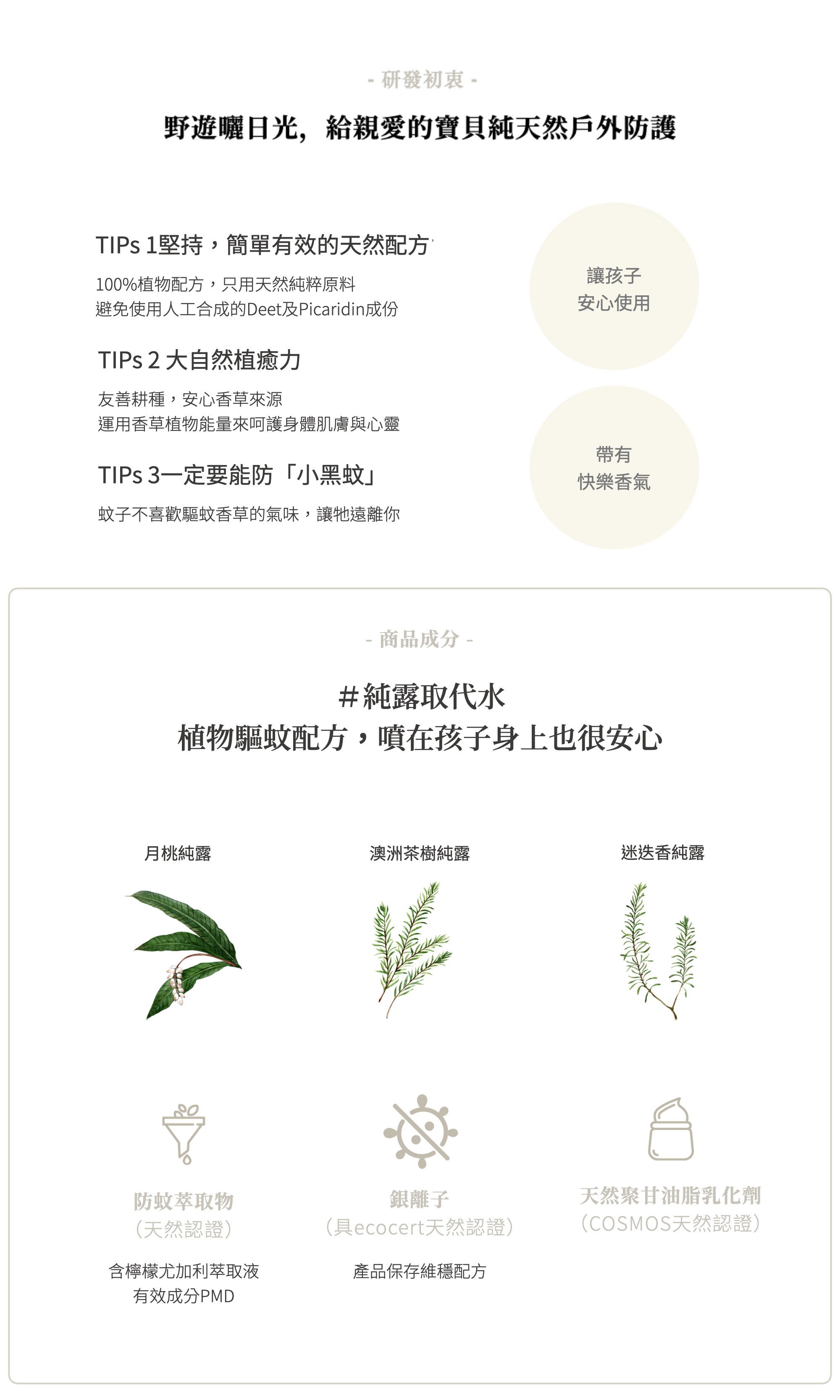 成 分 │ 月桃純露、澳洲茶樹純露、迷迭香純露、防蚊萃取物、天然聚甘油脂乳化劑、銀離子