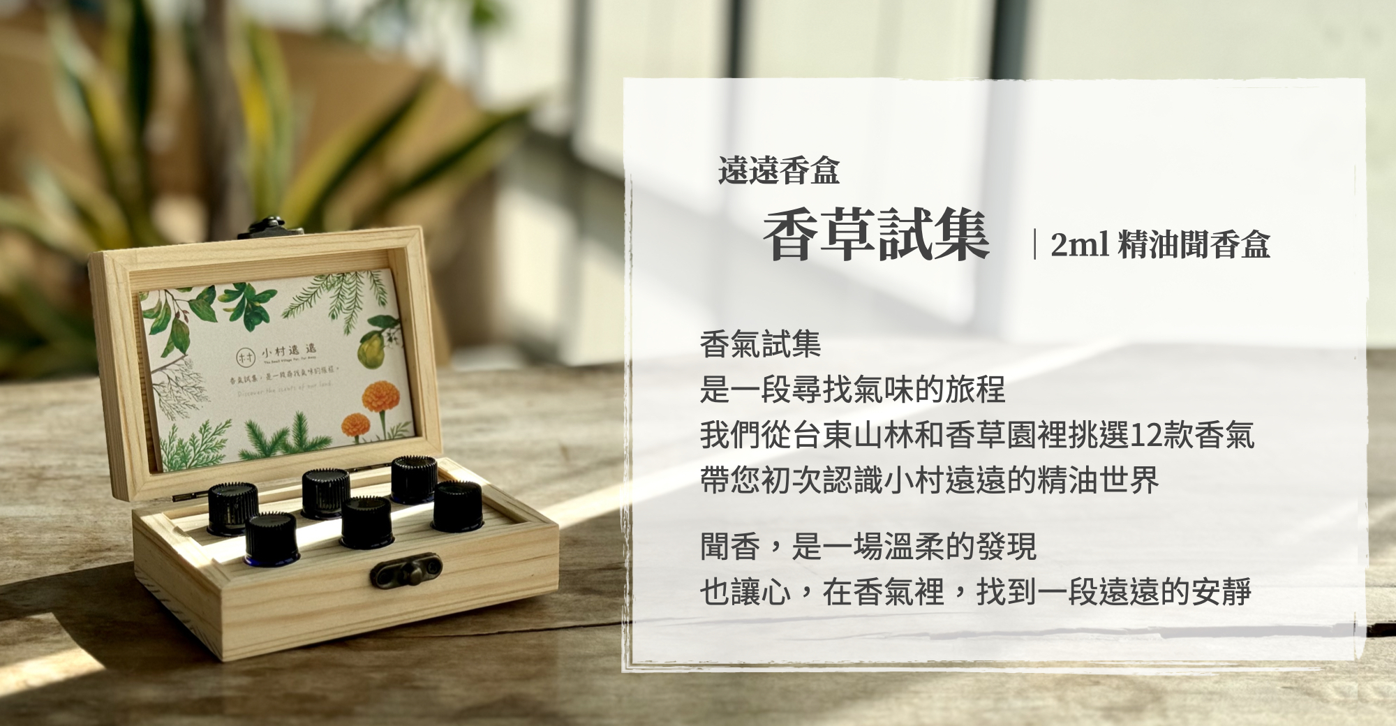 小村遠遠系列精油中,選香12款香氣組合成二個香盒,是我們為您搭配的香氣旅程: