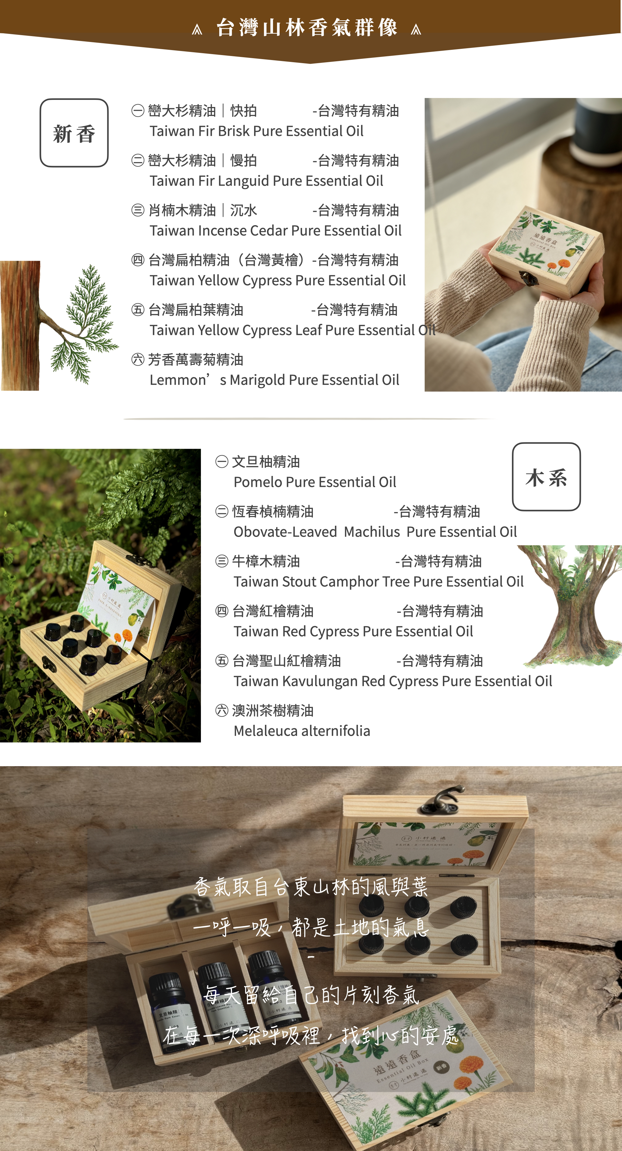成 分 │ 新香:巒大杉精油(快拍&慢拍)、台灣扁柏(木&葉)、肖楠木、芳香萬壽菊 精油