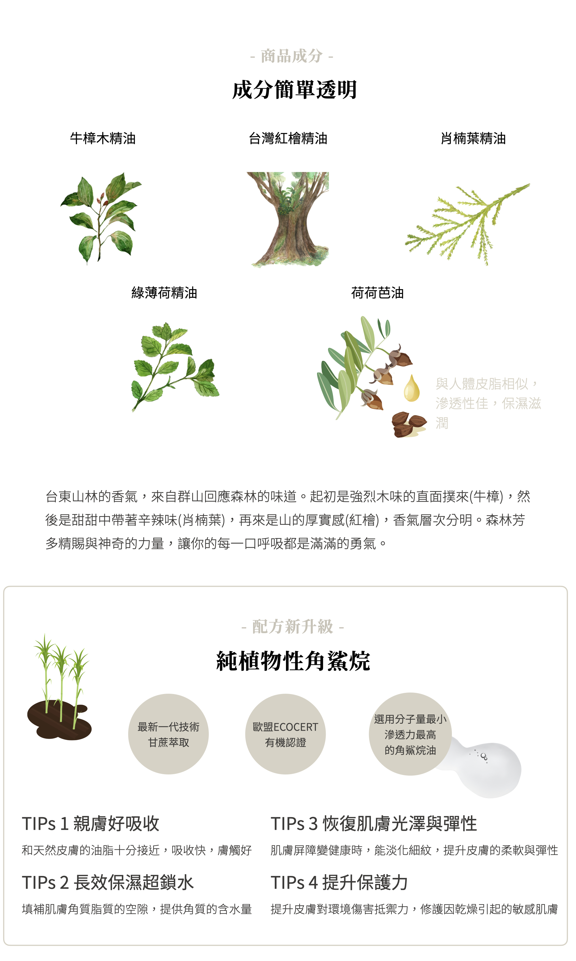 成 分 │ 牛樟木精油、台灣紅檜精油、肖楠葉精油、綠薄荷精油、植物性角鯊烷、荷荷芭油