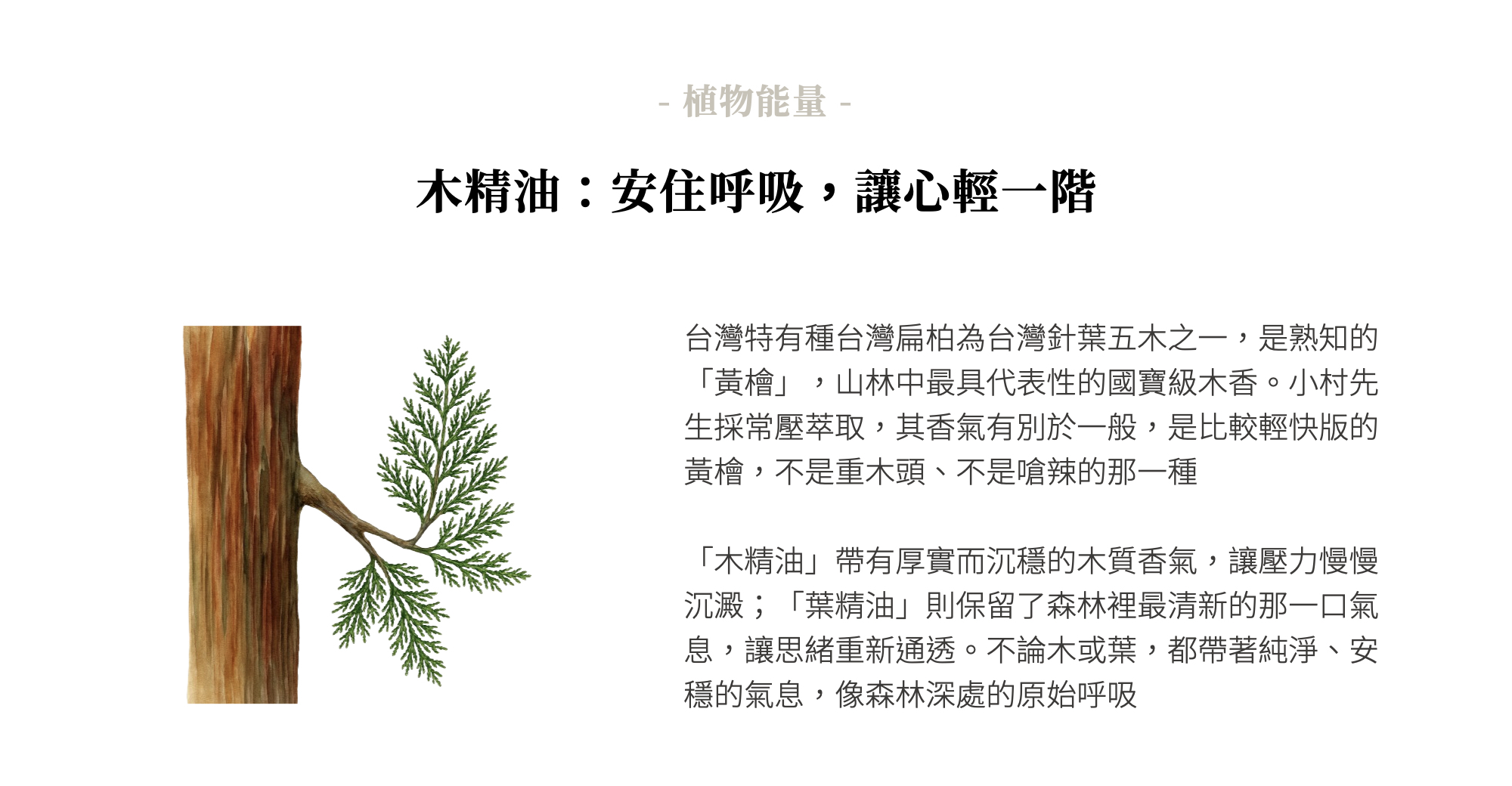 成 分 │ 100%台灣扁柏精油(黃檜) Chamaecyparis obtusa var. formosana