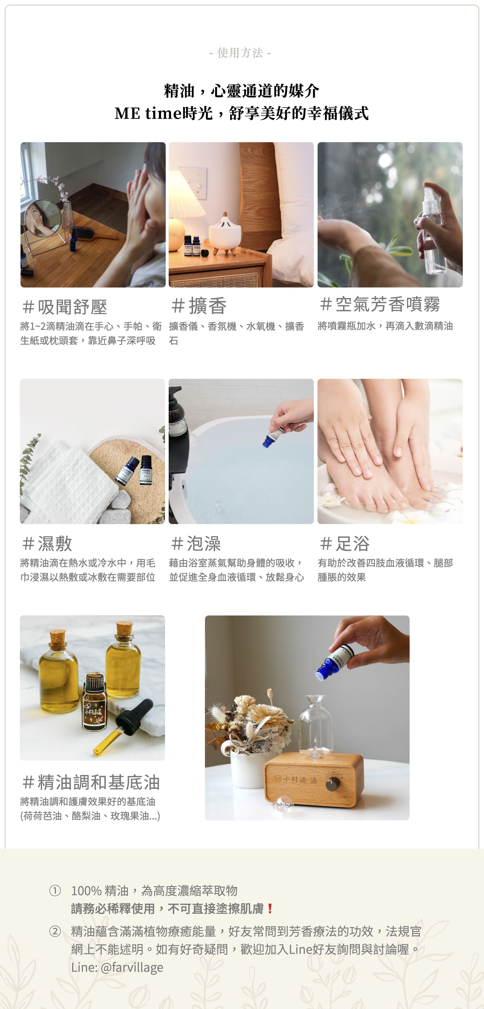 注意事項 │ 本產品為100%純精油,勿直接塗於肌膚上,須稀釋使用。孕婦、哺乳中,皮膚敏感或慢性病者使用前請先諮詢專業;擴香勿靠近寵物。